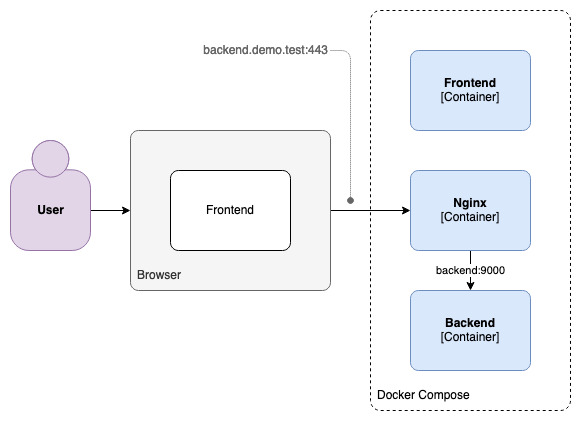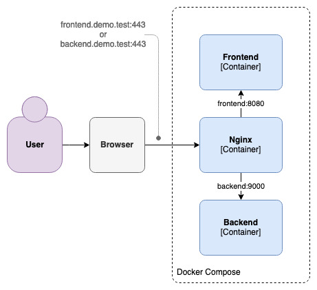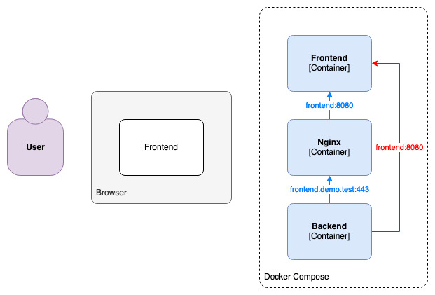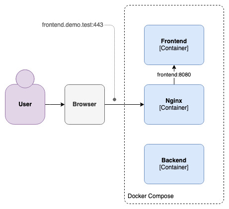 Эта слегка обновленная версия описывает, что происходит при первом обращении к frontend.demo.test: браузер запрашивает у Nginx содержимое фронтенда через порт 443; Nginx распознает доменное имя и передает запрос контейнеру фронтенда на порт 8080, который, в свою очередь, возвращает браузеру файлы для загрузки.
