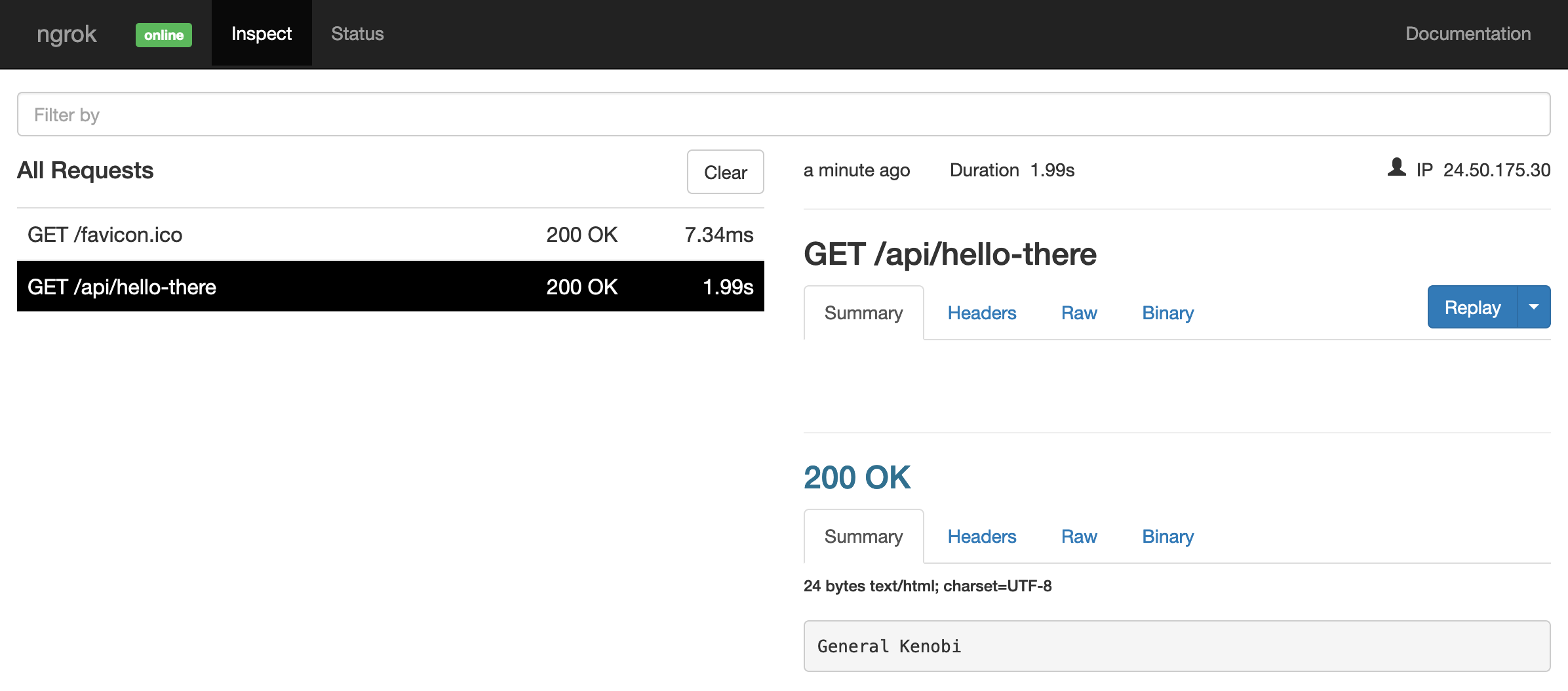 Теперь вы можете использовать этот URL в сторонних сервисах или распространять его сколько угодно, пока запущен контейнер Ngrok. Соответствующий трафик появится в интерфейсе, где вы сможете его просмотреть и воспроизвести запросы по своему усмотрению. Удобно!