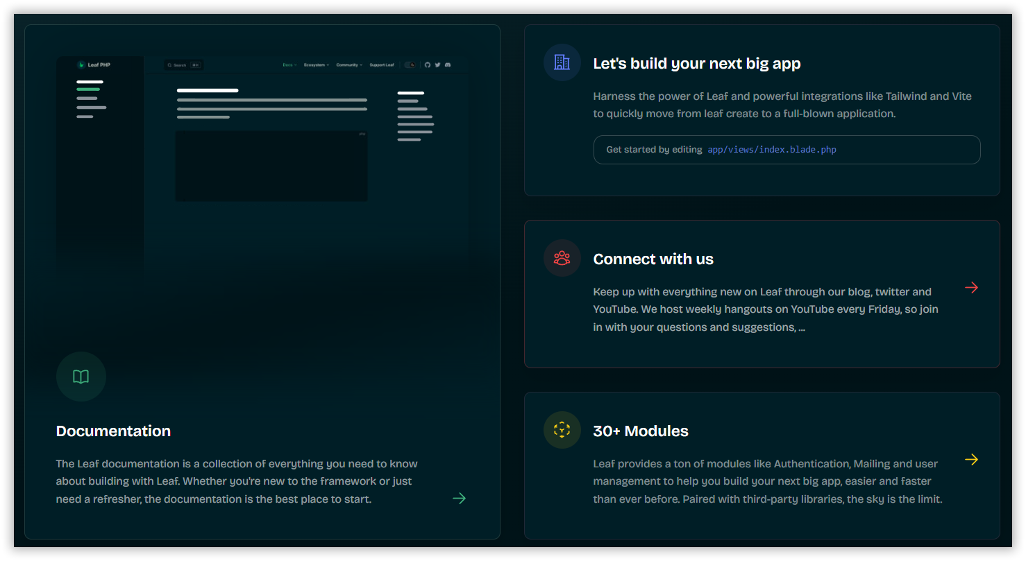 Сайт и документация фреймворка Leaf доступны по адресу https://leafphp.dev. Также доступен удобный пошаговый туториал.